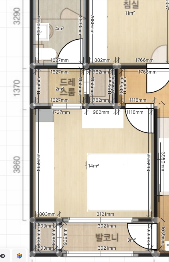우선 아래 베란다, 위 드레스룸 입구, 오른쪽 위 방문을 고려했을 때에 위와 같이 배치해봤는데 애매하네요 ㅠㅠ